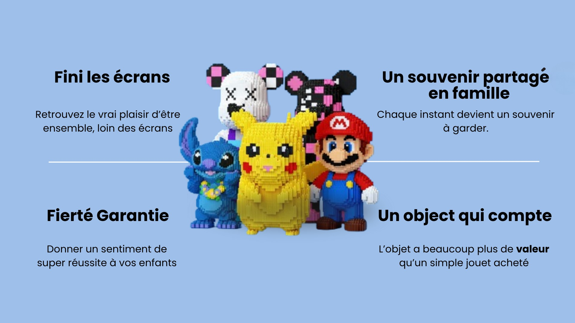 Bonne alternative aux écrans. Ma fille est devenue fan : elle a adoré construire et en redemande déjà. C’est vraiment addictif, et elle est super fière de voir ses personnages s’aligner sur son bureau comme une petite collection.